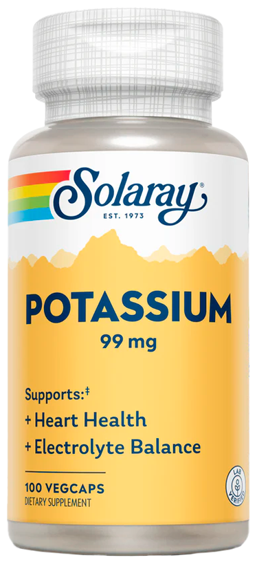 Каждая растительная капсула Solaray Калий 99 мг содержит оптимальную дозу калия - важного минерала, который способствует: