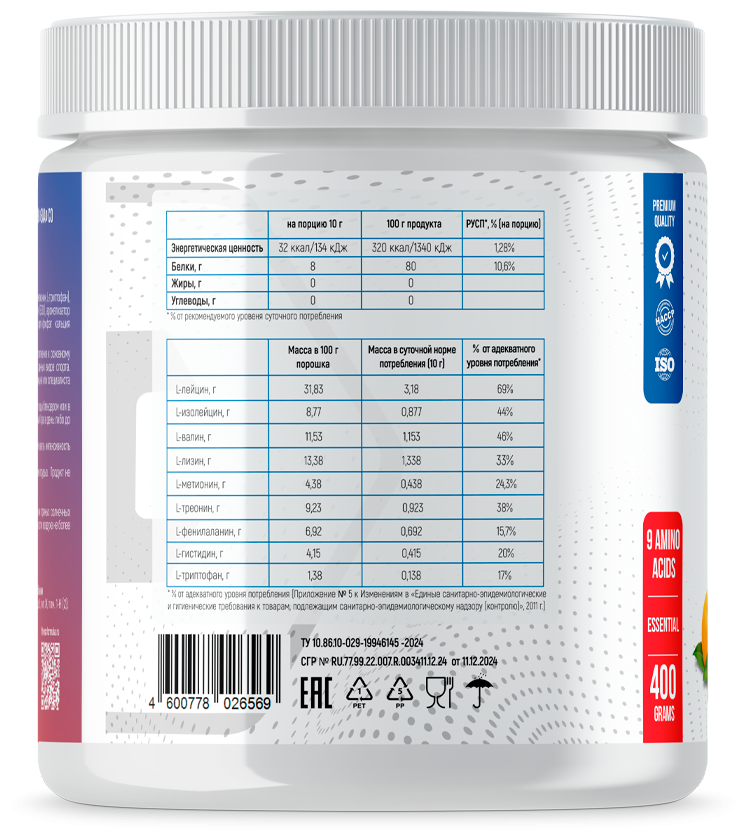 - Полный спектр EAA - 9 незаменимых аминокислот в оптимальном соотношении для быстрого усвоения.