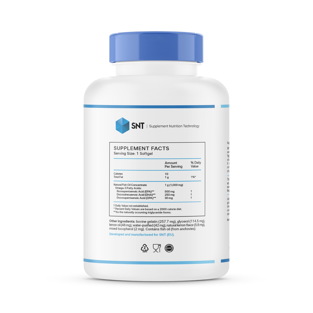 говяжий желатин (капсула) 257,7 мг, глицерин 114,5 мг, масло лимона 48 мг, очищенная вода 42 мг, натуральный ароматизатор лимон 5,8мг, концентрат смеси токоферолов 2мг. Источник омеги-концентрат рыбного жира (из анчоусов).