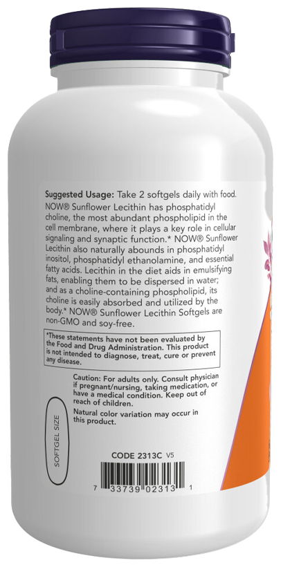 Подсолнечный лецитин содержит фосфатидилхолин, самый распространенный фосфолипид в клеточной мембране, который играет ключевую роль в сигнальной и синаптической функции клеток. Кроме того, подсолнечный лецитин содержит большое количество природного фосфатидилинозитола, фосфатидила этаноламина и незаменимых жирных кислот. Лецитин в рационе помогает эмульгировать жиры, позволяя им растворяться в воде. Организм с легкостью усваивает и использует холин, содержащийся в этом фосфолипиде.