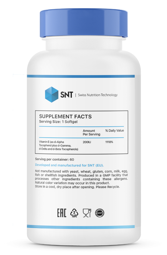 • Натуральный состав: Содержит d-альфа токоферол и смесь токоферолов (d-гамма, d-дельта, d-бета), что делает его эффективным и качественным источником витамина Е.
