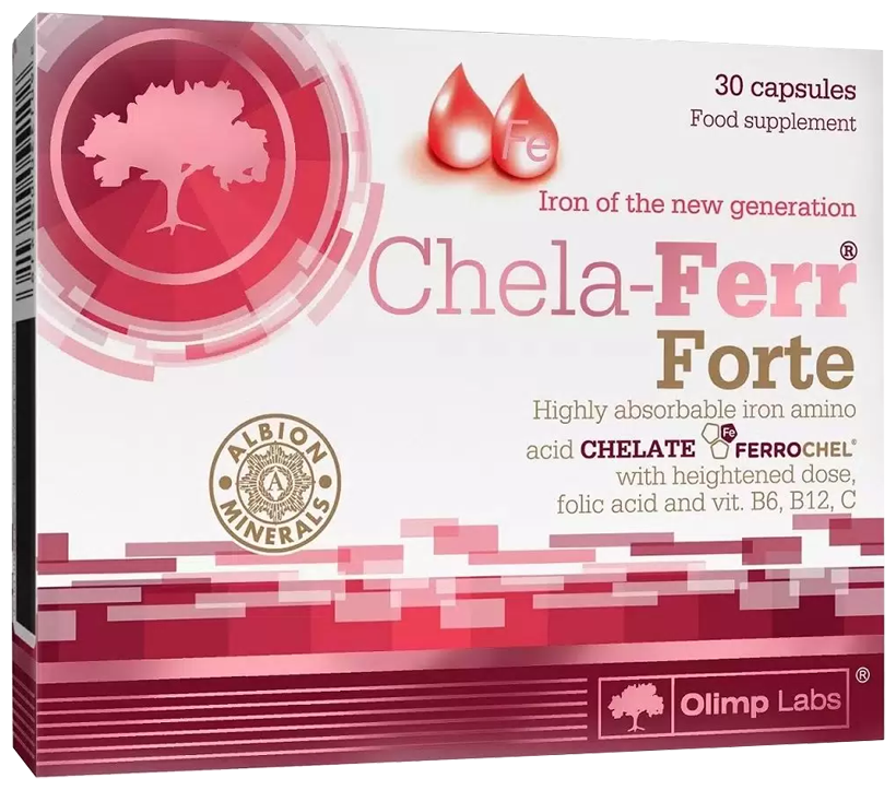 Chela-Ferr Forte - это комплекс, содержащий аминокислотный хелат железа, который является самым биодоступным и безопасным его видом. Он дополнен фолиевой кислотой, витаминами B6, B12 и витамином C.