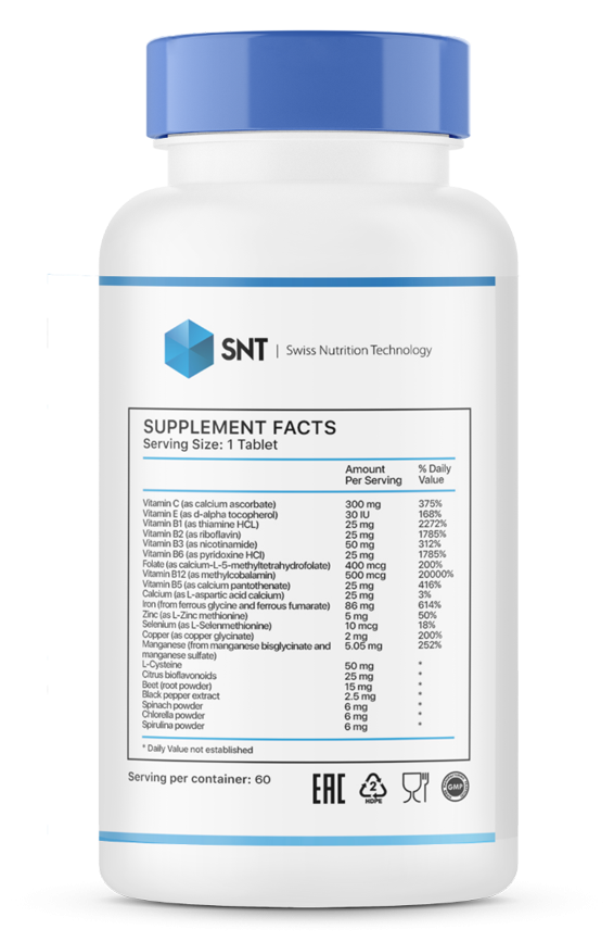 Железо (из глицина железа и фумарата железа) | 86 мг | 614% |